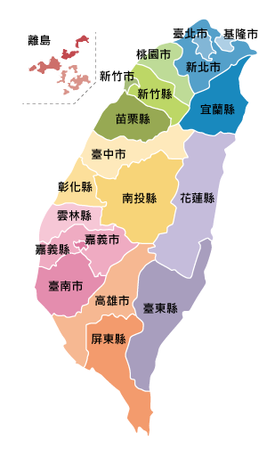臺北市 新北市 基隆市 桃園市 新竹市 新竹縣 苗栗縣 臺中市 彰化縣 南投縣 雲林縣 嘉義市 嘉義縣 臺南市 高雄市 屏東縣 臺東縣 花蓮縣 宜蘭縣 離島